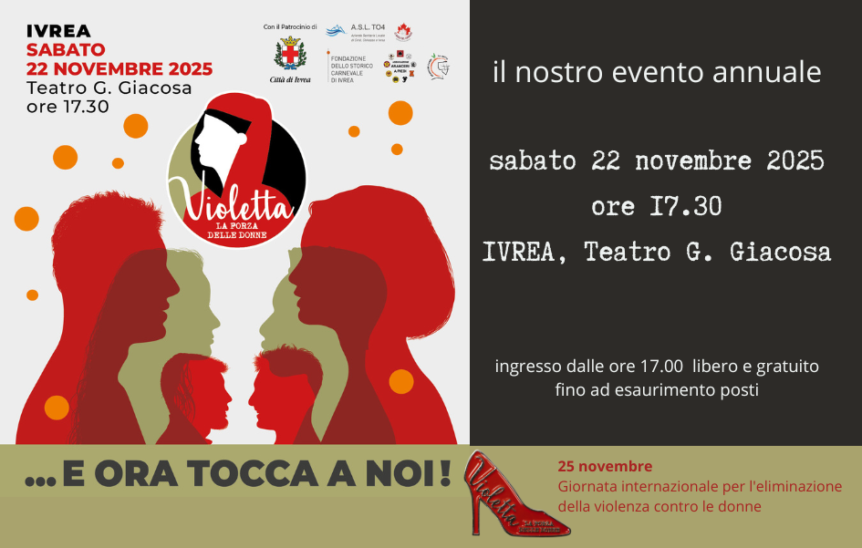 ….. E ora tocca noi! Questo è il titolo dell’evento, giunto alla sua nona edizione, e che è ormai diventato un appuntamento fisso presso il Teatro Giacosa di Ivrea, l’incontro aperto alla cittadinanza tutta che ogni anno organizziamo in concomitanza della Giornata internazionale per l’eliminazione della violenza contro la violenza contro le donne. È il momento durante il quale presentiamo le attività che si sono svolte nel corso dell’anno e che vuole consolidare il messaggio sull’importanza che la partecipazione attiva di ciascuno di noi può avere per contrastare il fenomeno della violenza domestica.